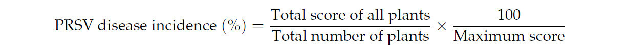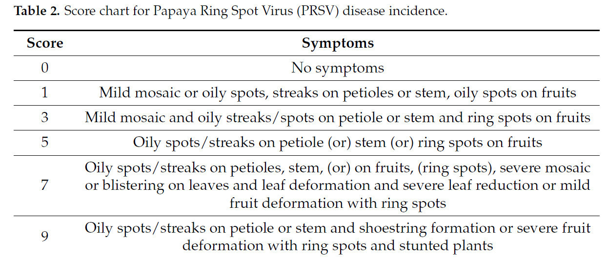 Заболеваемость вирусом кольцевой пятнистости папайи (PRSV) регистрировали с использованием оценочной шкалы от 0 до 9 (Таблица 2), предоставленной Дханамом (2006) [22], и оценивали заболеваемость.