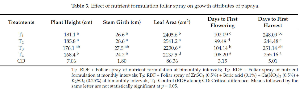 Результаты эксперимента показали, что листовое внесение питательного состава с месячными интервалами с 3-го по 7-й MAP (T2) значительно улучшило показатели роста папайи (Таблица 3), а именно: высоту растения (185,8 см), обхват стебля (28,6 см) и площадь листа (2541,2 см²). Дополнительно к этому, в той же обработке наблюдались раннее цветение (99 дней) и ранний сбор урожая (244 дня), тогда как контроль (T4) показал меньше показателей роста и позднее цветение (108 дней) и поздний сбор урожая (255 дней). Обработка с двухмесячным внесением питательного состава (T1) также показала результаты наравне с обработкой T2 по высоте растения (181,1 см) и обхвату стебля (26,6 см).