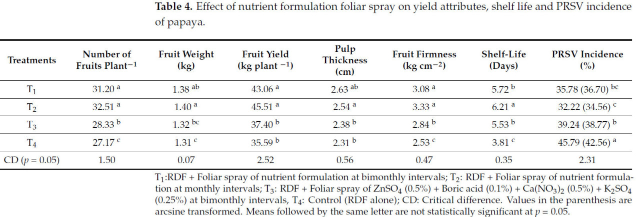 Показатели урожайности, а именно: количество плодов на растение (32,51), вес плода (1,40 кг), урожай плодов (45,51 кг с растения), твердость плода (3,33 кг·см⁻²) и лежкость (6,21 дня) были значительно улучшены при обработке с ежемесячным внесением питательного состава у папайи (T2) (Таблица 4). Однако обработка с двухмесячным внесением питательного состава (T1) также показала результаты наравне с обработкой T2 по количеству плодов (31,20), урожайности плодов (43,06 кг с растения) и твердости плода (3,08 кг·см⁻²). Контрольные растения показали сравнительно меньшую урожайность, а именно: на 21,80% меньше по сравнению с наиболее эффективной обработкой (T2). Лежкость плодов с растений, обработанных листовым внесением питательного состава с месячными интервалами (T2), была выше (6,21 дня), а наименьшее значение было зафиксировано в контроле (3,81 дня). Опрыскивание питательным составом с месячными интервалами (T2) привело к снижению заболеваемости PRSV на 29,64% по сравнению с контролем (T4) (Таблица 4).