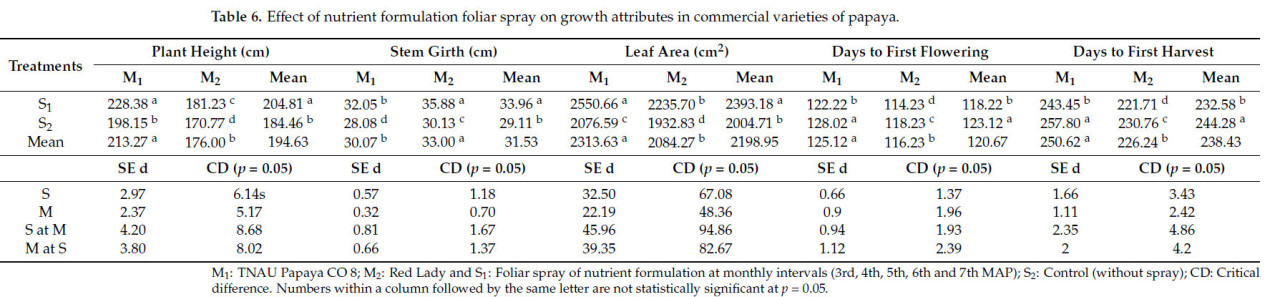 Крупномасштабные полевые испытания с TNAU Papaya CO 8 и Red Lady показали, что листовое опрыскивание питательным составом значительно улучшило показатели роста, урожайности и качества обоих сортов папайи. Напротив , заболеваемость PRSV была меньше у растений, подвергнутых листовой обработке. TNAU Papaya CO 8 с опрыскиванием питательным составом (M1S1) показал максимальную высоту растения (228,38 см), площадь листа (2550,66 см²), за которым следовал Red Lady с опрыскиванием питательным составом (M2S1); контрольная обработка у Red Lady (M2S2) показала минимальную высоту растения и площадь листа (Таблица 6). Red Lady с опрыскиванием питательным составом (M2S1) показал максимальный обхват стебля (35,8 см при первом сборе урожая) с ранним цветением (114 дней) и ранним сбором урожая (221 день), тогда как контрольная обработка у TNAU papaya CO 8 (M1S2) показала позднее цветение (128 дней) и поздний сбор урожая (257 дней) (Таблица 6).