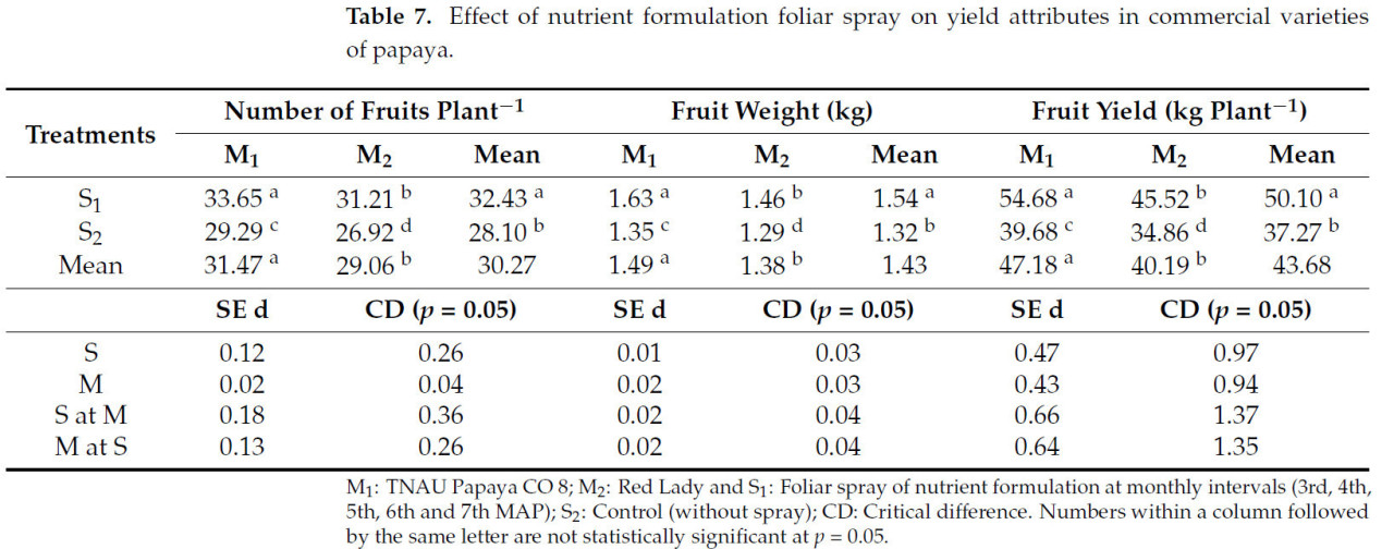 Максимальное количество плодов на растение (33,65), вес плода (1,63 кг) и урожай плодов (54,68 кг с растения) были зафиксированы у TNAU Papaya CO 8 с опрыскиванием питательным составом (M1S1). Однако сорт Red Lady, не получавший опрыскивания питательным составом (M2S2), показал меньшее количество плодов (26,92) с минимальным весом плода (1,29 кг) и урожайностью плодов (34,86 кг с растения) (Таблица 7).