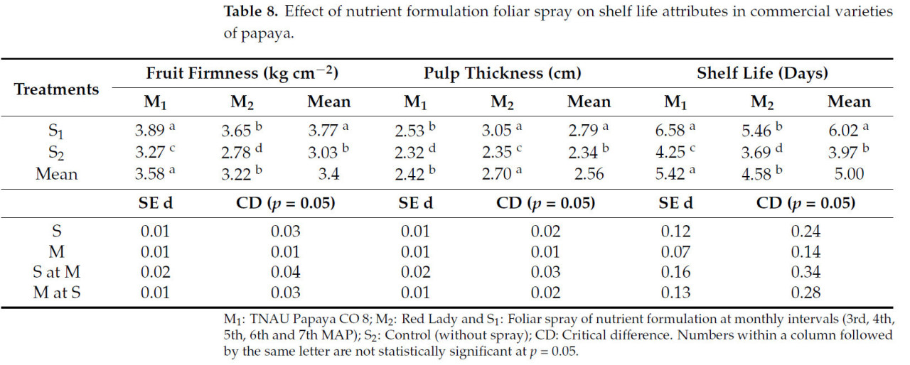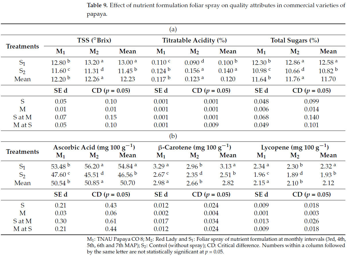 Сорт папайи Red Lady, получавший листовое внесение питательного состава с месячными интервалами (M2S1), показал более высокие TSS (13,20 °Brix), общие сахара (12,86%), аскорбиновую кислоту (56,20 мг·100 г⁻¹) с меньшей титруемой кислотностью (0,90%). Однако максимальные β-каротин (2,83 мг·100 г⁻¹) и ликопин (2,13 мг·100 г⁻¹) были зафиксированы у TNAU papaya CO 8 с листовым внесением питательного состава с месячными интервалами (M1S1). Контрольные растения обоих сортов показали наименьшие значения для всех проанализированных параметров качества (Таблица 9a,b).