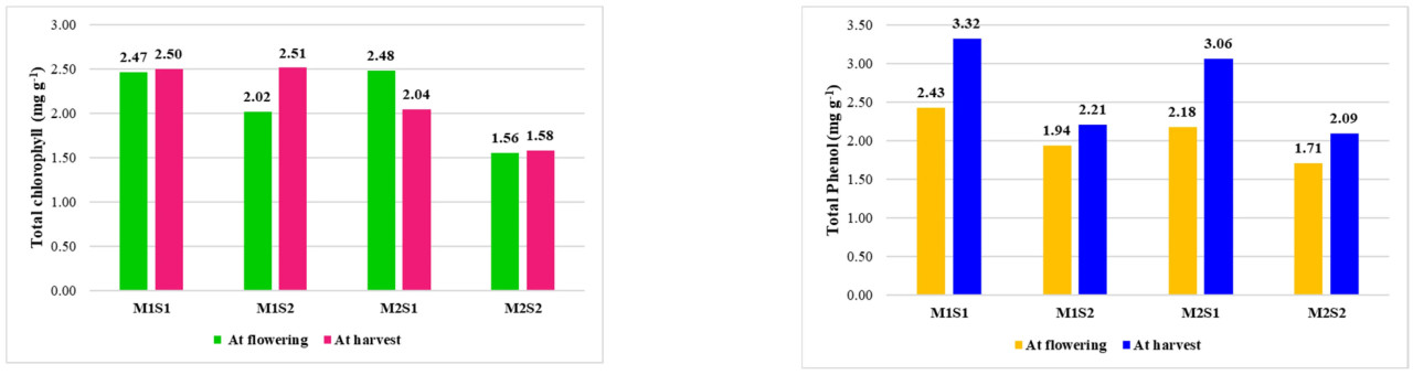 Листовое опрыскивание питательным составом значительно увеличило общий хлорофилл, общие фенолы и содержание питательных веществ в черешке листа у обоих сортов по сравнению с их соответствующим контролем. Общее содержание хлорофилла было максимальным как при первом цветении, так и при первом сборе урожая у сорта Red Lady, получавшего листовое опрыскивание питательным составом (M2S1), а именно: 2,479 мг·г⁻¹ и 2,513 мг·г⁻¹ соответственно, что наравне с TNAU papaya CO 8, получавшим листовое опрыскивание питательным составом (M1S1), а минимальное общее содержание хлорофилла 1,557 мг·г⁻¹ и 1,578 мг·г⁻¹ соответственно при первом цветении и при первом сборе урожая наблюдалось у M2S2 (Red Lady без опрыскивания питательным составом). По общему содержанию фенолов TNAU papaya CO 8, получавший листовое опрыскивание питательным составом с месячными интервалами (M1S1), показал максимум 2,431 мг·г⁻¹ и 3,321 мг·г⁻¹ при первом цветении и при первом сборе урожая соответственно, а минимальное общее содержание фенолов было зафиксировано у Red Lady, не получавшего листового опрыскивания питательным составом (M2S2) (Рисунок 1).