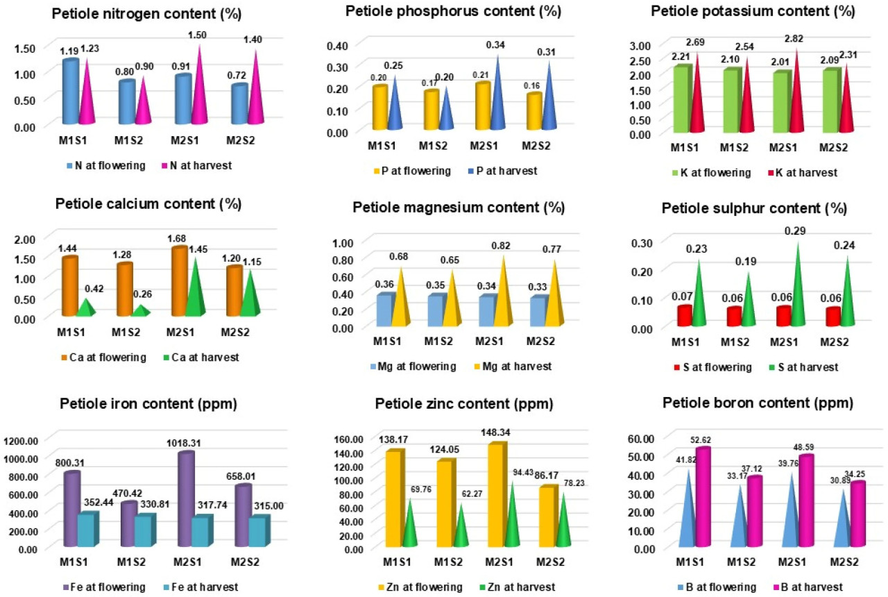 Максимальное содержание макроэлементов наблюдалось у TNAU papaya CO 8, получавшего листовое опрыскивание питательным составом (M1S1) при цветении, а именно: N (1,19%), P (0,21%) и K (2,21%), тогда как Red Lady, получавший листовое опрыскивание питательным составом (M2S1), показал самые высокие значения N (1,50%), P (0,34%) и K (2,82%) при сборе урожая (Рисунок 2). У обоих сортов содержание вторичных и микроэлементов было максимальным в обработках с листовым опрыскиванием по сравнению с контролем.