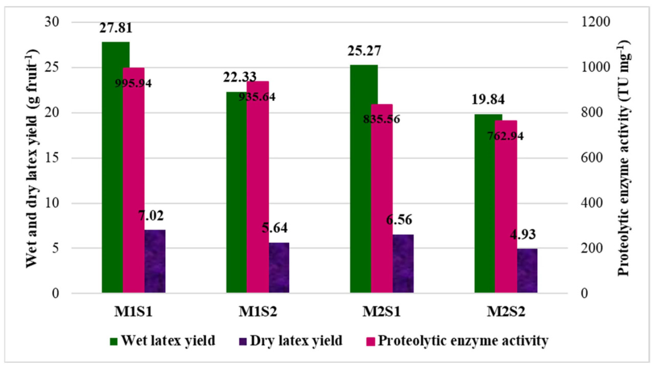 Листовое внесение питательного состава в высокой степени повлияло на выход папаина и протеолитическую активность фермента у обоих сортов. Обработка M1S1 (TNAU papaya CO 8 с листовым опрыскиванием питательным составом) показала высокий выход сырого латекса (27,81 г·плод⁻¹; 936,02 г·дерево⁻¹) и сухого латекса (7,02 г·плод⁻¹; 236,36 г·дерево⁻¹) с высокой протеолитической активностью фермента (995,94 ТЕ·мг⁻¹), за которым следовала M2S1 (Red Lady с листовым опрыскиванием питательным составом), тогда как обработка M2S2 (Red Lady без листового опрыскивания) имела минимальный выход папаина и активность папаина (Рисунок 4).