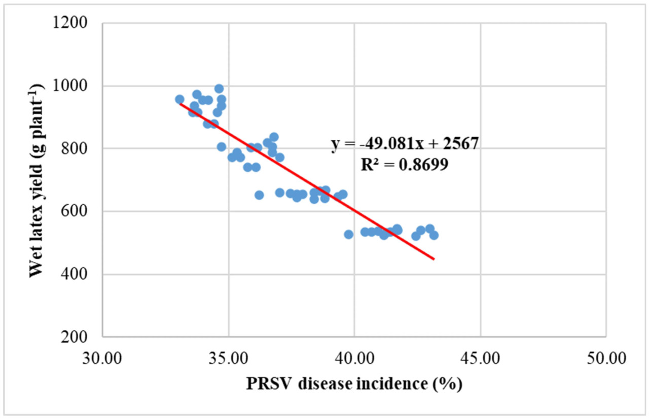 Результат показал значительную положительную линейную связь между урожайностью и выходом сырого латекса (R² = 0,940). Однако была значительная отрицательная линейная связь между урожайностью и заболеваемостью PRSV (R² = 0,808), а также между выходом сырого латекса и заболеваемостью PRSV (R² = 0,869) (Рисунок 5).