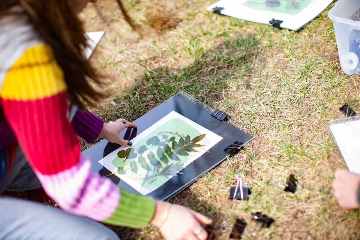 Ван Акен также провела мастер-класс по созданию ботанических цианотипов . Эти сине-голубые отпечатки создаются с помощью фотографического процесса, использующего светочувствительный раствор и воздействие ультрафиолетового света. Студенты использовали естественный свет для экспонирования своих цианотипов на ткани и бумаге и экспериментировали со смешиванием художественных техник и органических материалов.