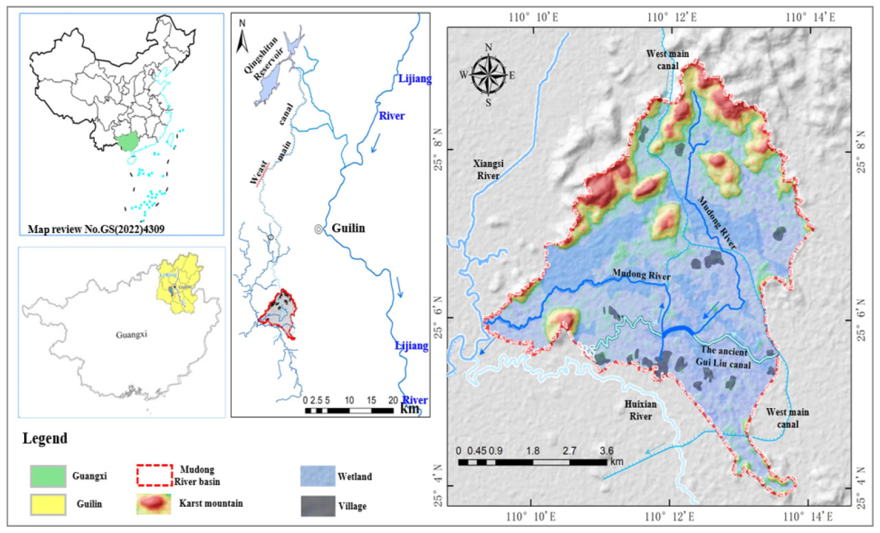 Водосбор Мудун (110°09′ – 110°14′ в.д., 25°04′–25°09′ с.ш.) расположен к северо-западу от города Гуйлинь в Гуанси (Рисунок 1). Он находится в центральной зоне водно-болотного угодья Хуйсянь на водоразделе между бассейнами Гуйлиня (река Лицзян) и Лючжоу (река Люцзян). Водно-болотное угодье Хуйсянь является одним из крупнейших природных карстовых водно-болотных угодий на юго-западе Китая, играя ключевую роль в регулировании региональной экологической среды. В региональном топографическом рисунке как поверхностные водные системы, так и направления дренажа основного подземного водотока сходятся к центральной структурной карстовой депрессии (т.е. району Хуйсянь) с северного и южного концов. Под постоянным и сложным взаимодействием поверхностных и подземных вод развились многочисленные озера и болота, в конечном итоге сформировав Карстовое водно-болотное угодье Хуйсянь.