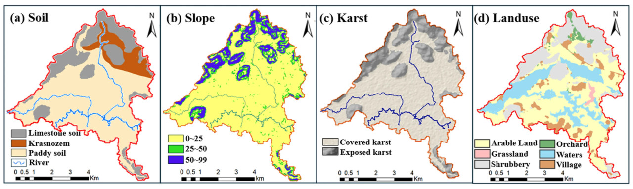 Рисунок 2. Распределение (a) почв, (b) уклона, (c) карста и (d) типов землепользования в районе исследования водосбора Мудун.