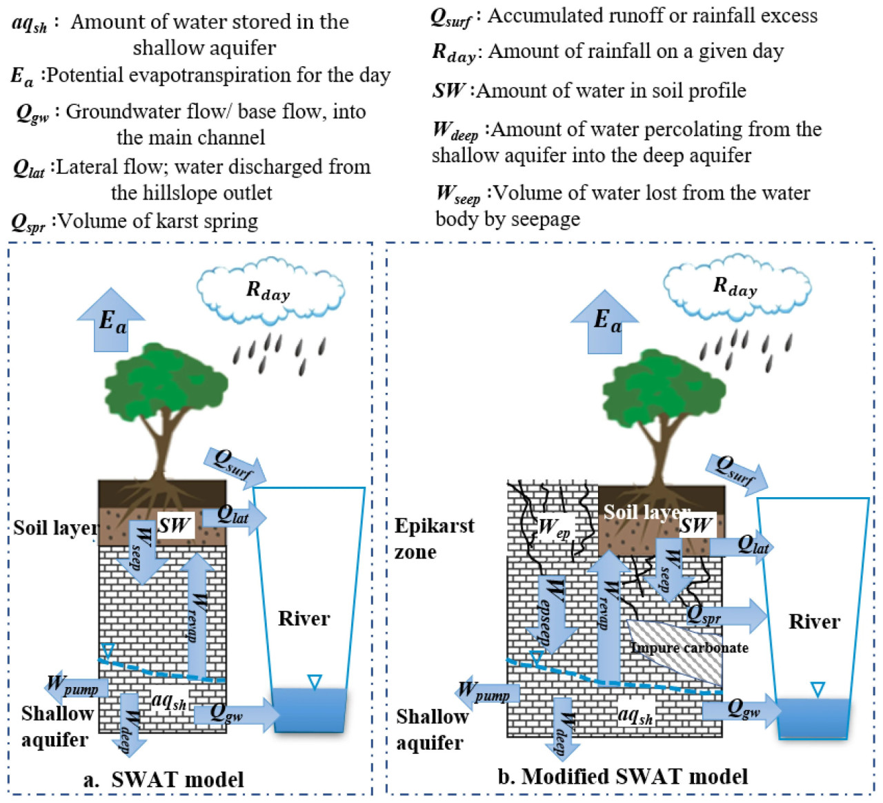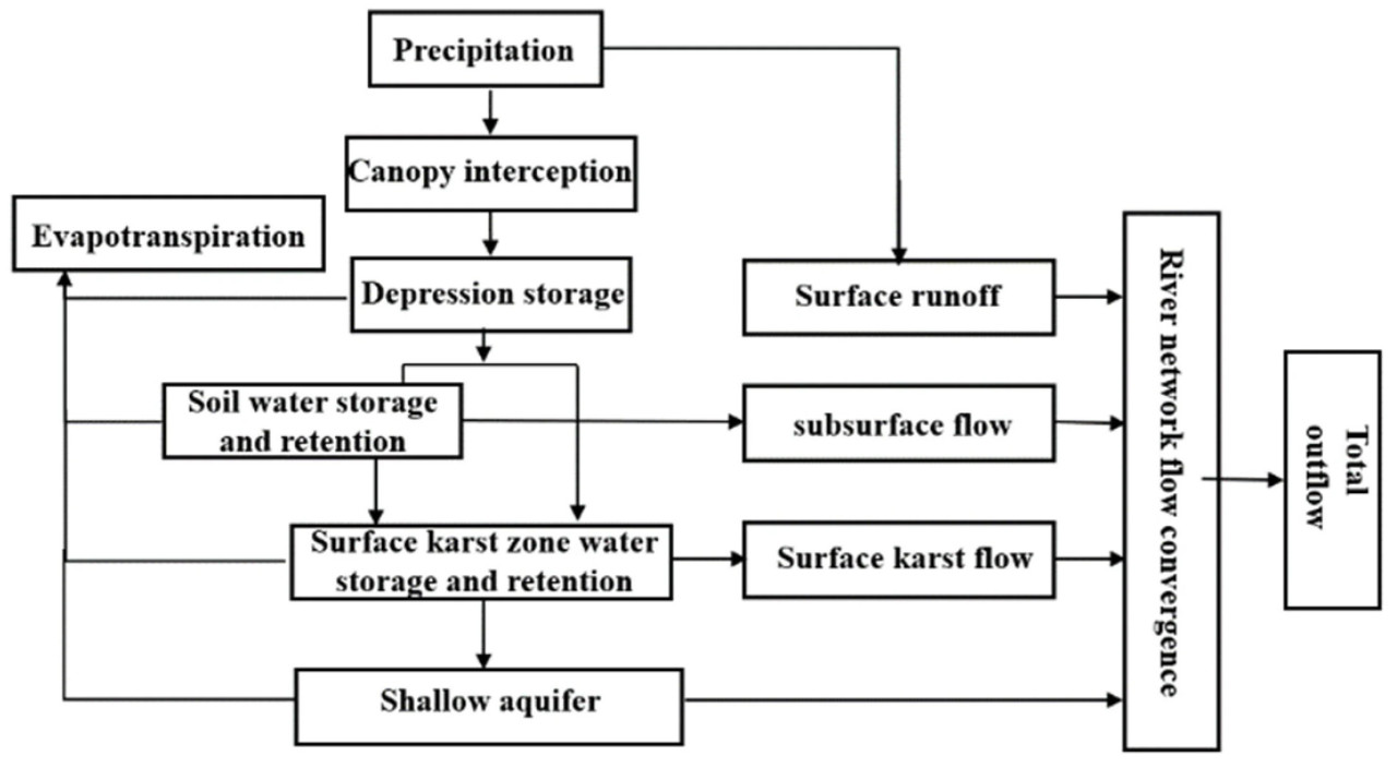 На юго-западе Китая, где обнаженные и перекрытые карстовые ландшафты перемежаются, просачивание воды через эпикарстовую зону склонно встречать нечистые карбонатные породы в центральной части водосбора. Эта геологическая особенность значительно затрудняет поток, приводя к выходу карстовых подземных вод на поверхность в виде источников, которые служат основным источником поверхностного стока. Дополнительно, незначительная часть подземного потока непосредственно присоединяется к речным каналам в форме подруслового потока. В ответ на эти гидрологические характеристики, данное исследование разработало и интегрировало поверхностный карстовый модуль в рамках структуры модели SWAT. Модуль эпикарста был добавлен в модель SWAT для улучшения ее процесса формирования водного потока. Рисунок 5 иллюстрирует вычислительный процесс модифицированной модели SWAT. По сравнению с моделью SWAT, модифицированная модель SWAT включает структуру гидрологического процесса эпикарстовой зоны между почвенным гидрологическим процессом и гидрологическим процессом мелких подземных вод, позволяя программе сначала выполнять расчеты потока эпикарста после запуска расчетов почвенного водного потока, а затем переходить к фазе расчета потока водоносного горизонта. Исходный код SWAT был модифицирован в соответствии с новой структурой расчета модели для точного отражения характеристик формирования подземных вод карстовых водосборов на юго-западе Китая.