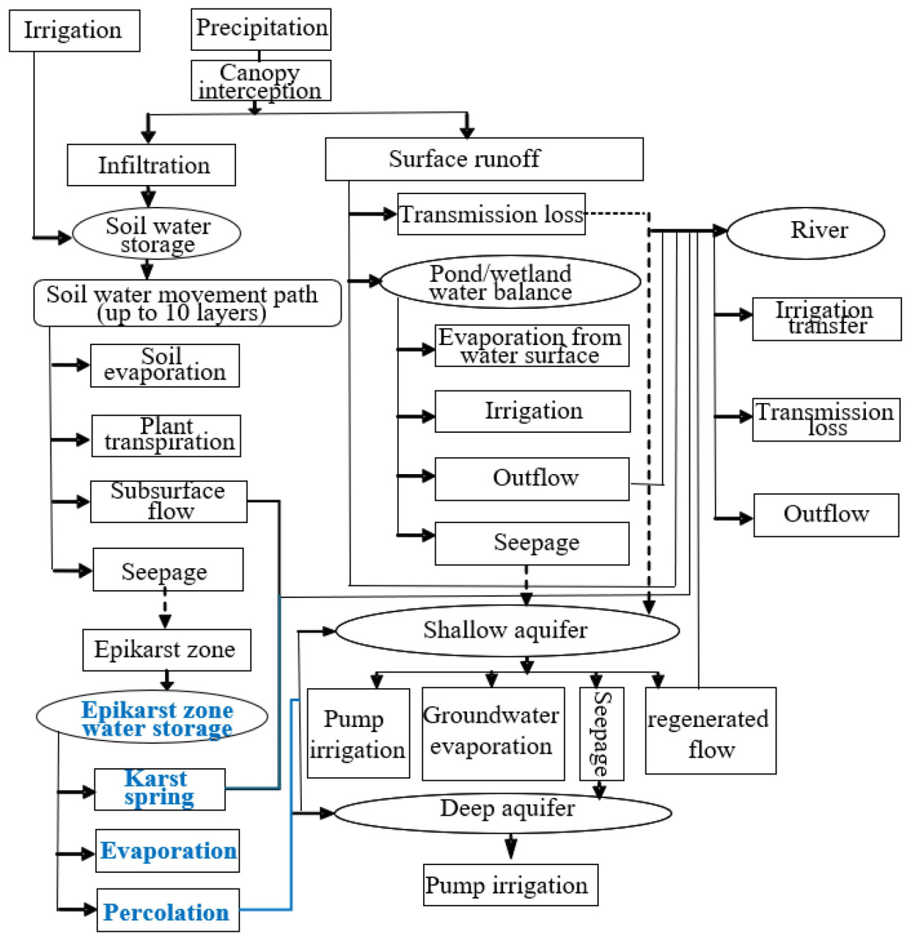 Рисунок 5. Гидрологический путь моделирования модифицированной модели SWAT с дополнительной эпикарстовой зоной (синим цветом).
