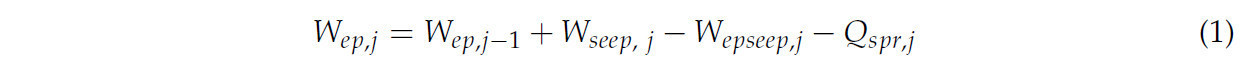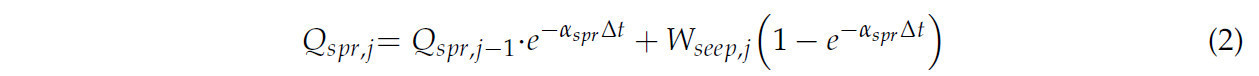 где 𝑄𝑠𝑝𝑟,𝑗 и 𝑄𝑠𝑝𝑟,𝑗−1 — расход источника из эпикарстовой зоны на день j и день (j − 1); 𝑊𝑠𝑒𝑒𝑝,𝑗 относится к Формуле (1) для подробностей; 𝛼𝑠𝑝𝑟 — коэффициент затухания расхода источника (дни); ∆𝑡 — временной шаг в днях. Количество воды, просачивающейся из эпикарстовой зоны в мелкий водоносный горизонт 𝑊𝑒𝑝𝑠𝑒𝑒𝑝, рассчитывается следующим образом: