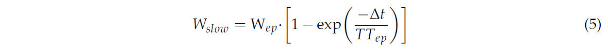 где 𝑊𝑠𝑙𝑜𝑤 — медленное просачивание воды в мелкий водоносный горизонт через малые карстовые пустоты в эпикарстовой зоне (мм) и 𝑊𝑒𝑝 — влагосодержание эпикарстовой зоны (мм). ∆t и 𝑇𝑇𝑒𝑝 — временной шаг и общее время движения воды (дни) соответственно.