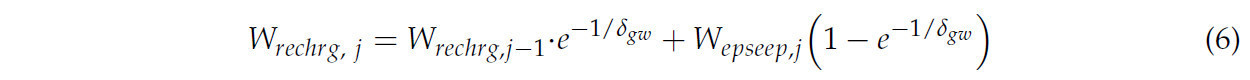 где 𝑊𝑟𝑒𝑐ℎ𝑟𝑔, 𝑗 и 𝑊𝑟𝑒𝑐ℎ𝑟𝑔,𝑗−1 — объемы пополнения мелких водоносных горизонтов на дни j и (j − 1) соответственно (мм); 𝑊𝑒𝑝𝑠𝑒𝑒𝑝,𝑗 — количество воды, поступающее в мелкий водоносный горизонт через дно эпикарстовой зоны на день J (мм); 𝛼𝑔𝑤 — регрессионный коэффициент базового стока; и 𝛿𝑔𝑤 и ∆t — время запаздывания пополнения и временной шаг (дни) соответственно.