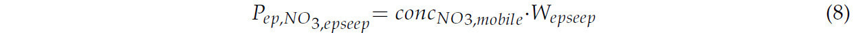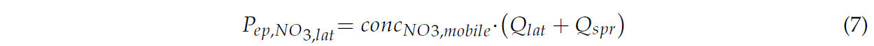где 𝑃𝑒𝑝,𝑁𝑂3,𝑙𝑎𝑡 — растворенные азотные нагрузки бокового потока в почвенном слое и эпикарстовой зоне (кг/га), 𝑐𝑜𝑛𝑐𝑁𝑂3,𝑚𝑜𝑏𝑖𝑙𝑒 — концентрация растворенного азота в свободной воде в почвенном слое и эпикарстовой зоне (кг/мм), 𝑄𝑙𝑎𝑡 — количество воды, вытекающее из почвенного слоя через почвенный поток (мм), 𝑄𝑠𝑝𝑟 — расход источника через эпикарстовую зону (мм), 𝑃𝑒𝑝,𝑁𝑂3,𝑒𝑝𝑠𝑒𝑒𝑝 — растворенная азотная нагрузка, мигрирующая со средненижней перколяцией в эпикарстовой зоне (кг/га), и 𝑊𝑒𝑝𝑠𝑒𝑒𝑝 — количество просачивающейся воды из эпикарстовой зоны в мелкий водоносный горизонт (мм).