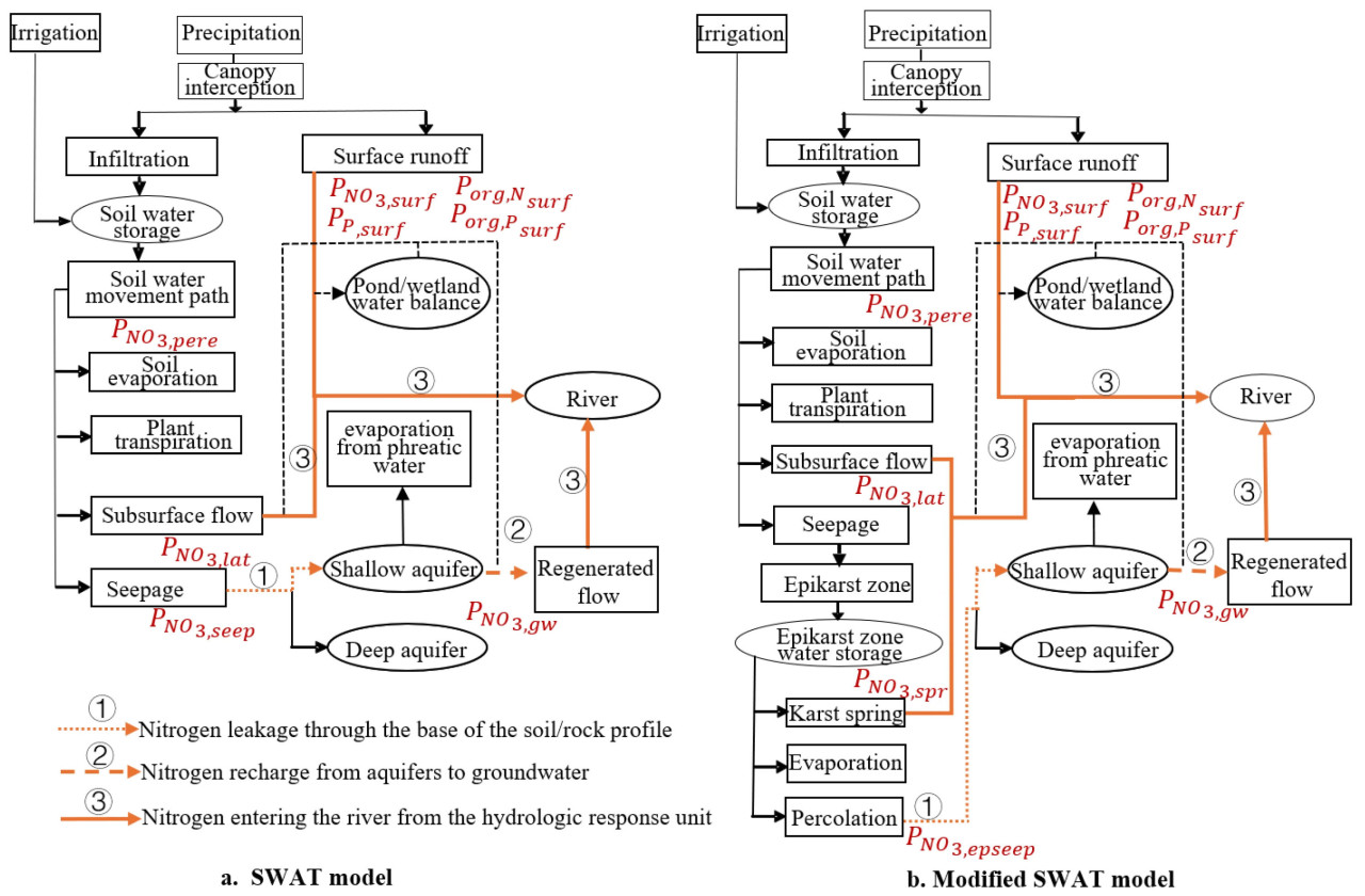 Рисунок 7a показывает расчет азота и фосфора, движущихся вдоль пути движения воды [40]. В модифицированной модели SWAT, нагрузки азота и фосфора варьировались в зависимости от количества свободной воды в почвенном слое и эпикарстовой зоне (Рисунок 7b).