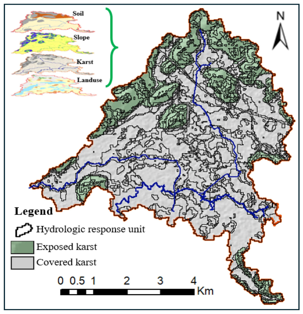 На основе использования пространственных данных (глобальный набор данных цифровой модели рельефа с разрешением 30 м от Облака геопространственных данных Центра компьютерных сетевых информационных технологий Китайской академии наук, https://www.gscloud.cn, (доступ 15 октября 2020 г.)), данных атрибутов почвы (разделенных на пять типов: известковая почва, рисовая почва, красный суглинок, водная площадь и голая порода) и данных типа землепользования (данные типа землепользования с разрешением 30 м × 30 м от Центра данных по наукам об окружающей среде и экологии Западного Китая, http://www.nieer.cas.cn/, (доступ 3 декабря 2020 г.)). На основе пространственного распределения естественных речных каналов в водосборе Мудун была применена процедура "прожига" для импорта сети водотоков, нарисованной в Google Earth. Затем было рассчитано направление водного потока, и речная сеть была извлечена с порогом площади водосбора 60 га для генерации распределения речной сети, более соответствующего реальной ситуации бассейна. Путем ручного добавления точек мониторинга поперечного сечения реки, модель SWAT делит водосбор Мудун на семь суббассейнов с площадью водосбора от 0.9 км² до 12.6 км². Множественные градиенты (0–24.9°, 24.9–50° и >50°) использовались для разделения единиц гидрологического реагирования бассейна. Водосбор Мудун разделен на 105 единиц гидрологического реагирования, включая 44 обнаженных и 61 перекрытых карстовых форм рельефа (Рисунок 8).