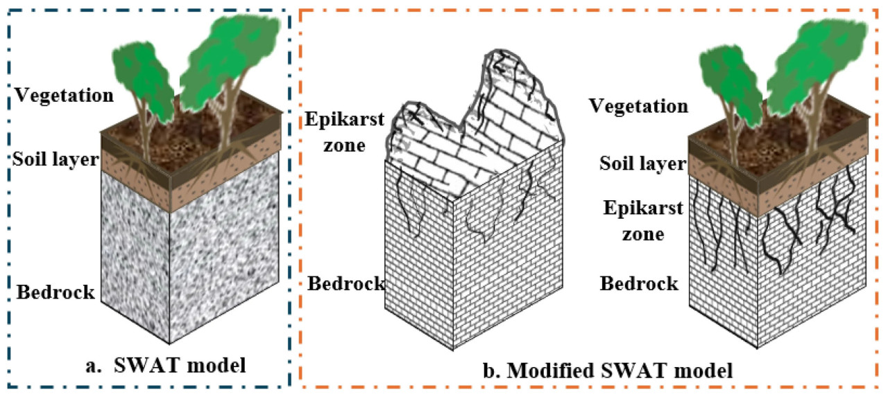 Следовательно, вертикальное распределение растительного покрова, почвенного слоя и коренной породы отличалось от такового в модели SWAT (Рисунок 9a). Модифицированная модель SWAT имеет два типа единиц гидрологического реагирования: один тип включает только эпикарстовую зону и коренную породу, а другой делится в вертикальном направлении на растительный покров, почвенный слой, эпикарстовую зону и коренную породу (Рисунок 9b) в вертикальном направлении.