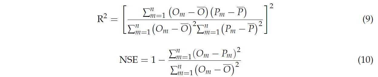 где 𝑂𝑚 представляет наблюдаемое значение для m-го временного шага, 𝑂 обозначает среднее всех наблюдаемых данных за период моделирования, 𝑃𝑚 представляет смоделированное значение для m-го временного шага, а 𝑃 обозначает среднее всех смоделированных значений за период моделирования.