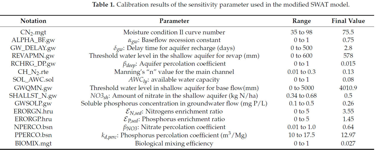 Таблица 1. Результаты калибровки чувствительного параметра, использованного в модифицированной модели SWAT.