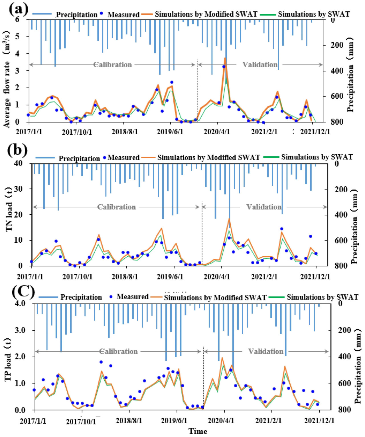 Результаты моделирования модифицированной модели SWAT на Рисунке 10b и Рисунке 10c показывают, что R² и NSE месячной нагрузки TN в период калибровки составляют 0.77 и 0.70 соответственно, в то время как в период проверки они составляют 0.73 и 0.68 соответственно. R² и NSE месячной нагрузки TP в период калибровки составляют 0.68 и 0.67 соответственно, в то время как в период проверки они составляют 0.67 и 0.66 соответственно, что указывает на то, что смоделированные значения месячной нагрузки TN и TP в бассейне хорошо соответствуют измеренным значениям и в основном удовлетворяют требованиям точности моделирования.