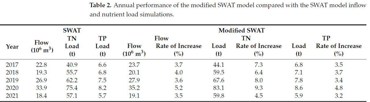 Таблица 2. Годовая эффективность модифицированной модели SWAT по сравнению с моделированием притока и нагрузки питательных веществ моделью SWAT.
