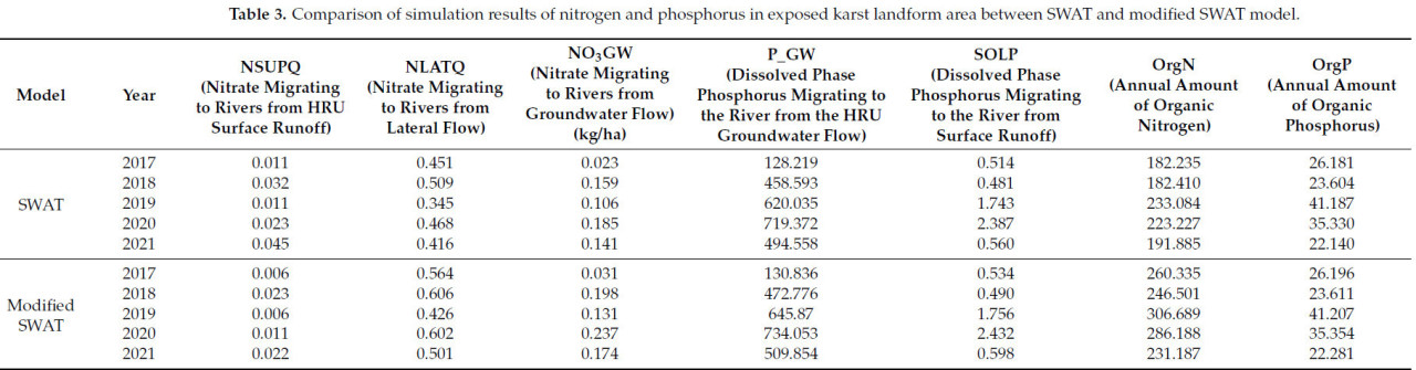 Таблица 3. Сравнение результатов моделирования азота и фосфора в районе обнаженного карстового рельефа между моделью SWAT и модифицированной моделью SWAT.