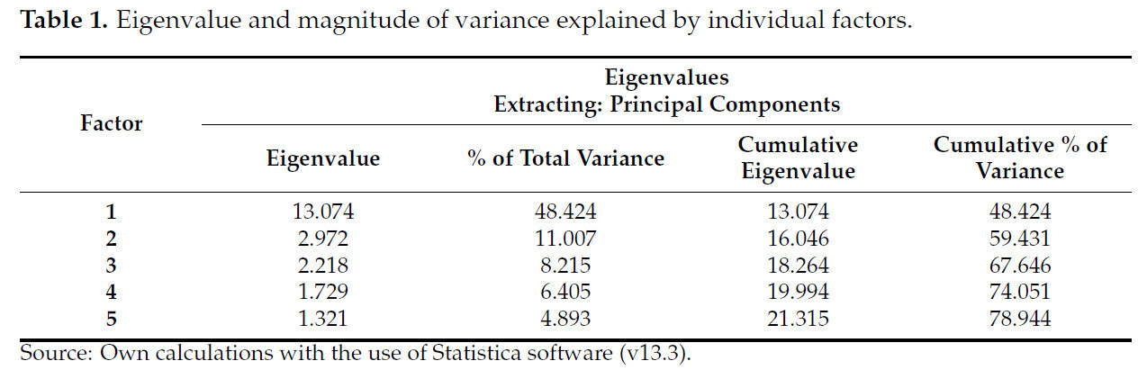 По критерию сферичности Бартлетта p-значение составило 0,0481 (p-значение меньше 0,05), что означает, что гипотезу о том, что корреляционная матрица является единичной, следует отвергнуть, что является обоснованием для проведения анализа главных компонент. Уменьшение размерности оправдано. С другой стороны, общий критерий KMO для переменных составил 0,521, что также можно считать обоснованием для проведения дальнейшего анализа. На основе собственного значения и % объясненной дисперсии проанализированных переменных мы определили пять основных факторов (Таблица 1). Каждый принятый основной фактор состоял из набора переменных, которые были рассчитаны на основе статистических данных. Принятый подход охватил 79% общей дисперсии данных, причем наибольшее влияние оказал фактор один (объясняя более 48% общей дисперсии). Важно, что факторы с собственными значениями ниже 1 не включались в исследование.