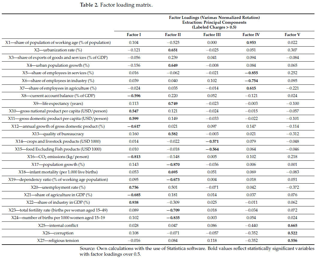Во-первых, степень анализа была ограничена доступностью статистических данных. Для анализируемой группы стран был собран набор из 38 показателей, определяющих социально-экономическую ситуацию с особым акцентом на переменные, характеризующие сельскохозяйственный сектор. Их отбор основывался на фактических соображениях и доступности данных. Выбор показателей развития всегда связан с определенной субъективностью. Различные авторы [46,47] по-разному квалифицируют виды деятельности, направленные на достижение поставленных целей, и присваивают им соответствующие меры, но концепция включения социально-экономических аспектов в исследование с упором на сельскохозяйственный и политический секторы соблюдалась. Таким образом, в данной статье отбор переменных основывался на литературных исследованиях. Однако, поскольку предлагаемая модель является лишь примерной, при применении модели могут быть рассмотрены другие измеримые и сопоставимые признаки.