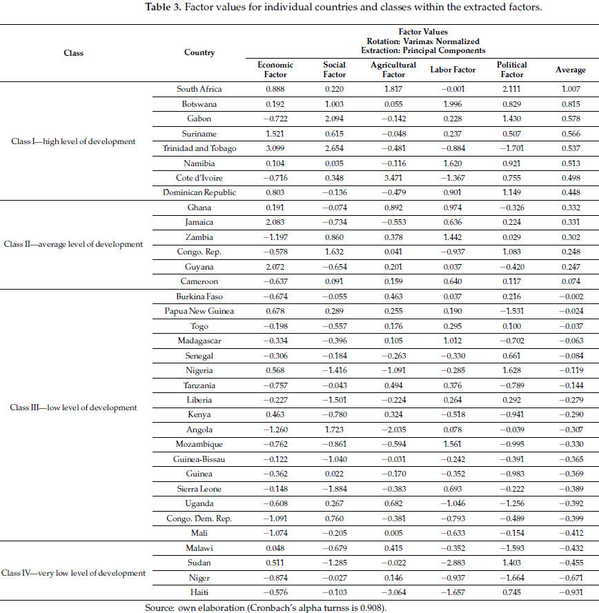 Таблица 3. Значения факторов для отдельных стран и классов в рамках выделенных факторов.