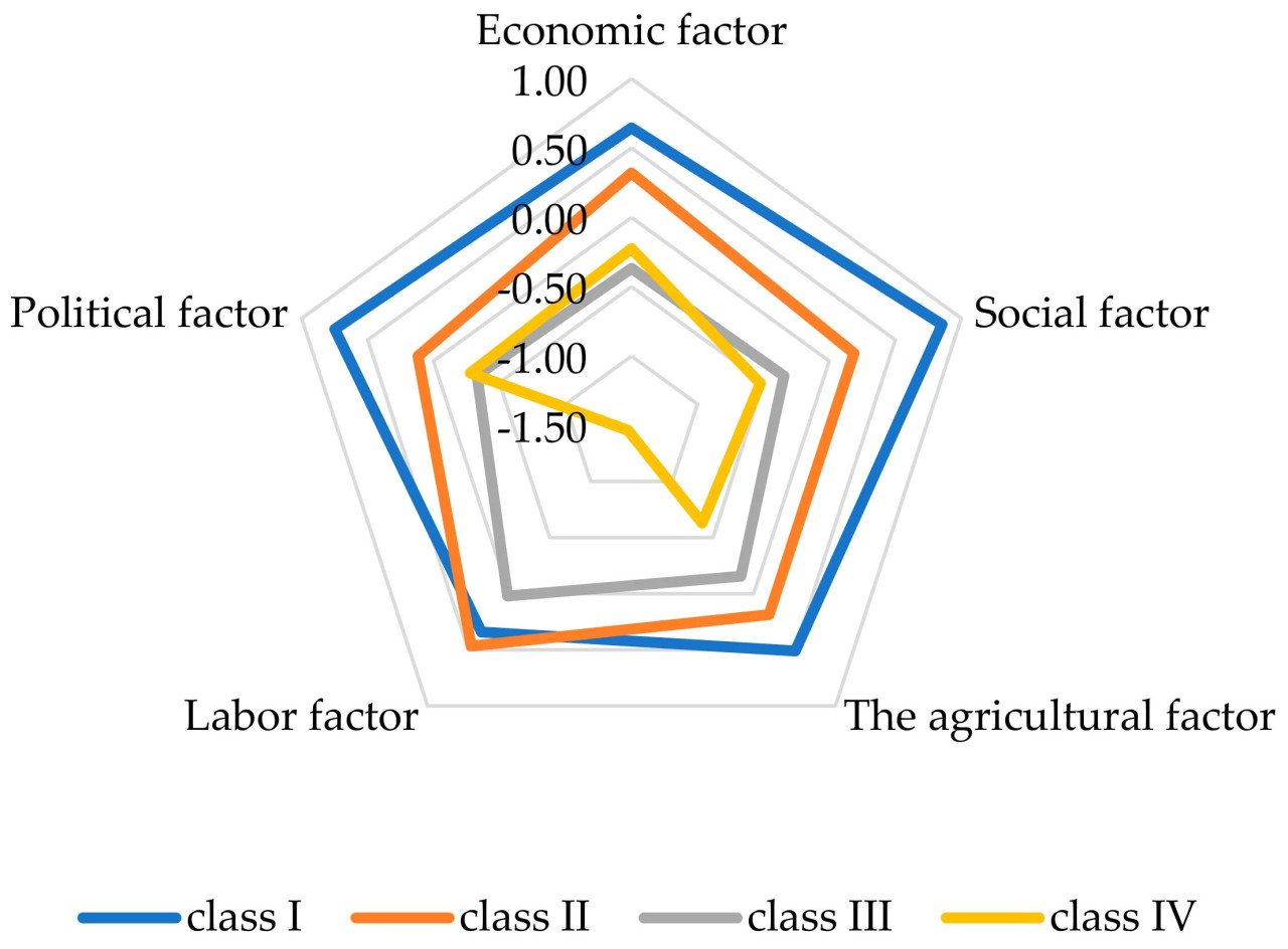 Результаты показывают дифференциацию социально-экономического развития между типологическими классами. В Классе I практически все факторы были развиты лучше среднего и даже наиболее развиты (за исключением трудового фактора), а значимость сельскохозяйственного сектора (измеряемая долей сельского хозяйства в ВВП и долей занятых в сельском хозяйстве) была заметно ниже, чем в других группах. В Классе II экономический фактор, социальный фактор, сельскохозяйственный фактор, трудовой фактор и политический фактор приняли положительные значения, что означает, что их уровень выше среднего для стран АКТ. Кроме того, класс со средним значением индекса развития показал преимущество по всем факторам перед странами с низким и очень низким значением индекса развития. В Классе II наблюдается постепенное снижение значимости сельского хозяйства в экономике, в то время как доля промышленности оставалась стабильной, а значимость услуг возрастала. Отрицательные значения факторов, ниже среднего для стран АКТ, характеризовали класс III (за исключением трудового фактора). Последний класс — страны с очень низким значением индекса развития — характеризовался относительно высокими значениями экономического фактора и политического фактора (более высокие значения, чем в Классе III), в то время как другие факторы принимали самые низкие значения, значительно ниже среднего (Рисунок 2). В Классах III и IV сельскохозяйственный сектор играл ключевую роль в экономиках (Класс III: 54% занятых в сельском хозяйстве, 26% ВВП; Класс IV: 56% занятых в сельском хозяйстве, 25% ВВП).