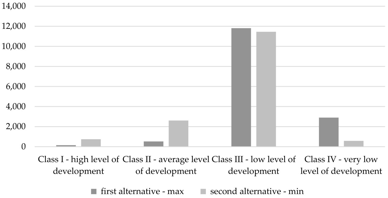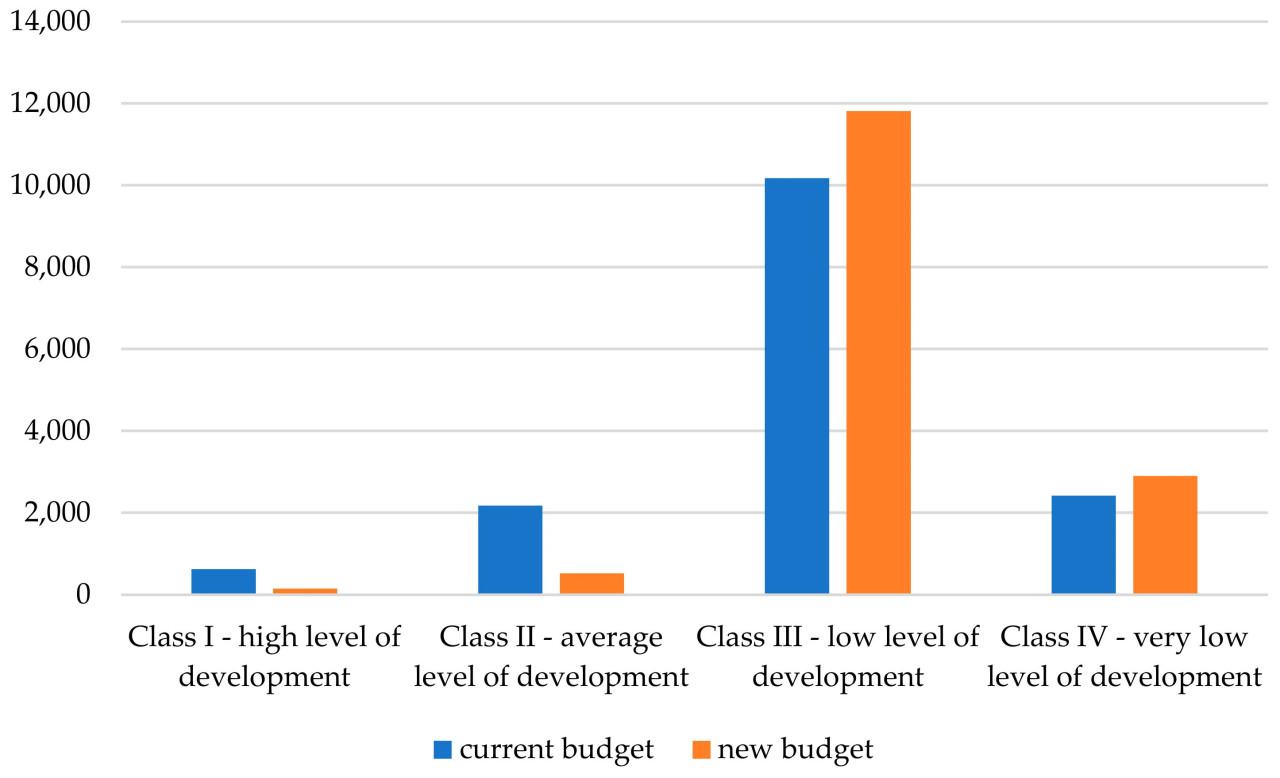 Два первоначальных подхода суммированы на Рисунке 5. Класс III в обоих подходах должен финансироваться более сильно. Это подтверждается несколькими фактами. В основном страны этого класса характеризуются высокой средней занятостью в сельскохозяйственном секторе (более 53%) и высокой долей сельского хозяйства в ВВП (26%). Кроме того, этот класс является самым многочисленным, что приводит к самому высокому финансированию. Для других групп различия в модельном распределении двух вариантов распределения больше.