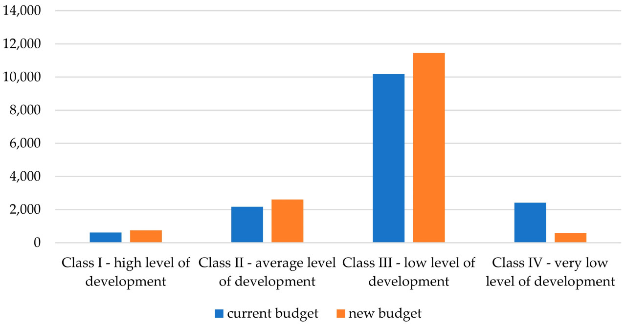 В предположении минимизации бюджета поддержка будет направляться в более развитые страны. Результаты показывают, что более высокая, чем текущая, поддержка развития направляется в Классы I, II и III. Наибольший рост поддержки по отношению к фактическому распределению был для Класса III (Класс III должен получать примерно на 12,5% больше финансирования, чем текущий бюджет). В свою очередь, для класса стран с самым низким уровнем развития финансирование было сокращено на 24% по сравнению с текущим распределением. В ситуации минимизации построенной целевой функции больше поддерживаются страны с относительно лучшей социально-экономической ситуацией. Класс I получил относительно высокое финансирование. Классы I и II должны были увеличить свой новый бюджет в среднем на 20% (Рисунок 4).