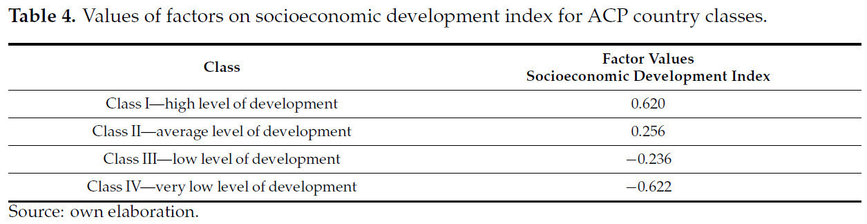 Таблица 4. Значения факторов индекса социально-экономического развития для классов стран АКТ.
