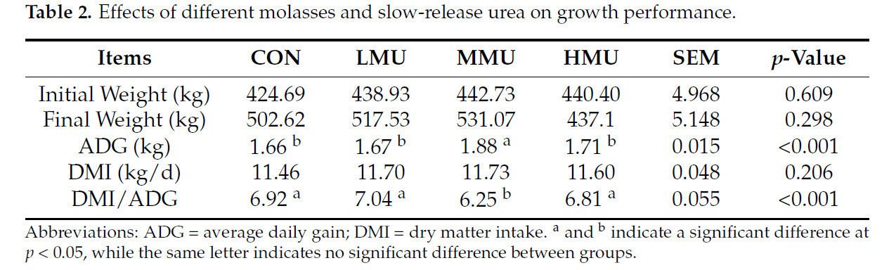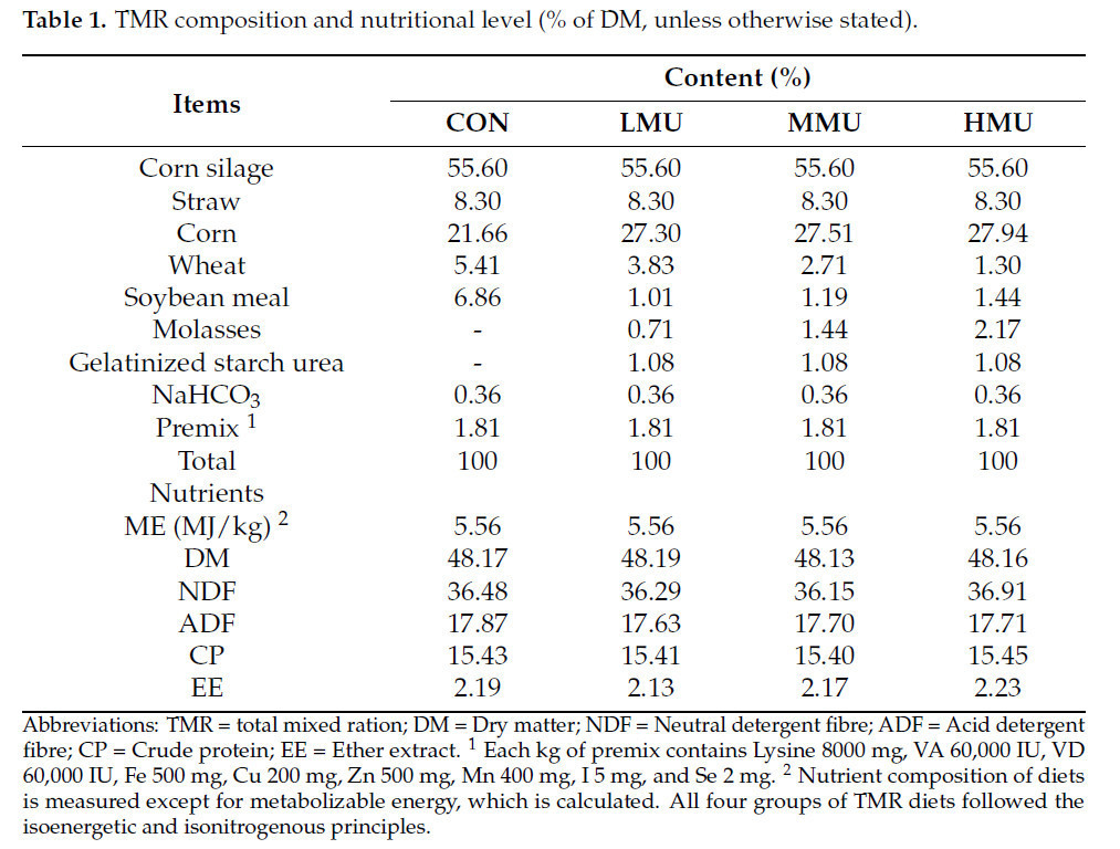 Целью данного исследования было изучение влияния различных комбинаций уровней патоки и медленнодействующей мочевины на бычков голштинской породы на откорме. Шестьдесят бычков голштинской породы схожего возраста, веса и состояния здоровья были случайным образом разделены на четыре группы по пятнадцать голов в каждой. Все схемы кормления были следующими: (1) группа на основном рационе (CON, контроль); (2) группа с 2% патоки и медленнодействующей мочевиной (LMU); (3) группа с 4% патоки и медленнодействующей мочевиной (MMU); (4) группа с 6% патоки и медленнодействующей мочевиной (HMU).