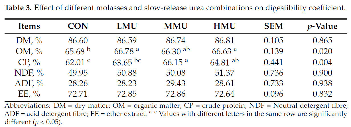 Переваримость питательных веществ показана в таблице 3. Кажущаяся переваримость ОВ и СР была выше, чем в CON, во всех опытных группах. Кажущаяся переваримость ОВ была значительно выше, чем в CON, как в группе LMU, так и в группе HMU (p < 0,05). Кажущаяся переваримость СР была значительно выше, чем в CON и LMU, в группе MMU (p < 0,05), и не отличалась от таковой в группе HMU. Различия в кажущейся переваримости СВ и СЖ между опытными группами были не значительны.
