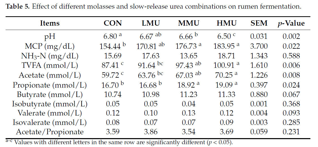 Сямси и др. обнаружили, что рубцовый pH у коз в опытной группе с хорошей синхронизацией высвобождения азота был значительно снижен [23]. В исследованиях in vitro Ли и др. обнаружили, что pH снижался с увеличением содержания водорастворимых углеводов (WSC) после добавления смеси WSC (инулин и сахароза; 80:20) к райграсу [26]. Колебания pH рубца напрямую влияют на эффективность брожения и здоровье животного, в то время как увеличение летучих кислот сопровождается снижением pH [27]. Это согласуется с результатами настоящего эксперимента, где pH был ниже во всех опытных группах, чем в контрольной группе, что соответствовало увеличению продукции VFA при рубцовом брожении. NH₃-N является наиболее важным источником синтеза MCP, и скорость синтеза MCP также зависит от ферментируемых CHO. Когда энергия ограничена или NH₃-N недостаточно, MCP не может быть эффективно синтезирован, что приводит к накоплению аммиака в рубце и повышению уровня аммиака [28]. Содержание MCP во всех опытных группах было выше, чем в CON, а содержание MCP в группах MMU и HMU было значительно выше, чем в CON. Синхронизация высвобождения энергии и азота значительно влияет на синтез микробного белка [29]. В MMU синхронизация высвобождения энергии и азота лучше, больше аммиака эффективно используется для производства MCP, а содержание аммиачного азота ниже.