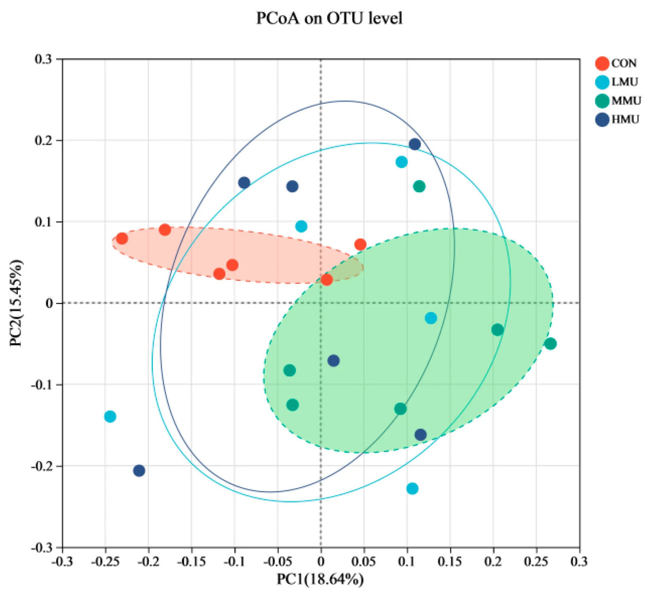 Для сравнения различий в структуре бактериальных колоний между опытными группами различия между опытными группами сравнивали более наглядно с помощью диаграммы размаха на основе анализа главных координат (PCoA) алгоритма расстояния Брея–Кертиса. Как показано на рисунке 2, различия в составе сообщества между CON и MMU были велики, в то время как состав сообщества LMU и HMU был более схож с составом как CON, так и MMU (между ними).