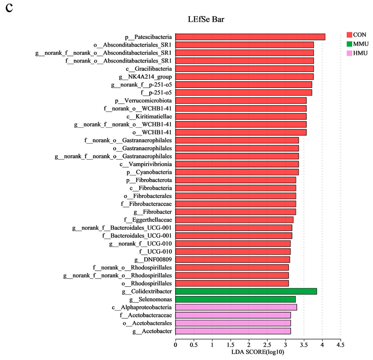 На основе данных о численности сообщества, полученных с помощью рангового критерия Крускала–Уоллиса, было проведено проверочное тестирование для видов между микробными сообществами различных опытных групп для оценки уровня значимости различий в численности видов, а затем были получены значимо различающиеся виды между группами. Как видно на рисунке 4а, на уровне рода NK4A214_group, norank__f__p-251-o5, norank__f__norank__o__Absconditabacteriales_SR1 и Fibrobacter были значительно повышены в CON по сравнению с другими группами, в то время как в MMU значительно повысились Colidextribacter и Selenomonas. Видовые различия на различных уровнях таксономии показаны в форме дендрограмм развития, которые наглядно отражают дифференциальные виды на уровне различных иерархий видов, полученных между различными опытными группами. LEfSe, показанный на рисунке 4b,c, в основном анализировал опытные группы (CON, LMU, MMU и HMU) и дал в общей сложности 38 значимо различающихся микробиот с порогом LDA 3. Из них 32 вида были значимо обогащены в CON и 4 микроорганизма были значимо обогащены в HMU. Было определено, что в CON присутствуют следующие типы: Cyanobacteria (p = 0,002, LDA: 3,35), Fibrobacterota (p = 0,016, LDA: 3,28), Patescibacteria (p = 0,032, LDA: 4,08) и Verrucomicrobiota (p = 0,026, LDA: 3,57). На уровне рода относительная численность родов Fibrobacter (p = 0,016, LDA: 3,28) и UCG-010 (p = 0,049, LDA: 3,13) была значительно выше, а относительная численность родов Colidextribacter (0,032, LDA: 3,85) и Selenomonas (p = 0,01, LDA: 3,28) была значительно выше в MMU. Роды были значительно выше по относительной численности, и род Acetobacter был значительно выше в HMU (p = 0,001, LDA: 3,14).