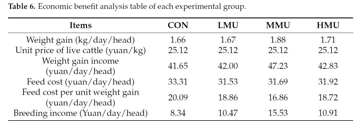 Основываясь на расчете цен на сырье для пастбищ в январе 2024 года, цена готового кукурузного силоса составляет 600 юаней/тонну, рисовой соломы — 500 юаней/тонну, кукурузы — 2300 юаней/тонну, пшеничных отрубей — 1750 юаней/тонну и соевого шрота — 3600 юаней/тонну. Кроме того, текущая цена патоки составляет 2000 юаней/тонну, медленнодействующей мочевины — 2400 юаней/тонну, пищевой соды — 2300 юаней/тонну, а премикса для мясного скота — 3200 юаней/тонну. Анализ комплексных экономических выгод с учетом различных среднесуточных привесов в каждой группе указывает на то, что включение 4% патоки и 3% медленнодействующей мочевины в рационы откормочного скота — с заменой части концентратов — дает наибольшее экономическое преимущество. Этот модифицированный рацион приводит к стоимости корма, которая ниже, чем у CON, экономя 1,62 юаня в день на голову. Дополнительно, доход от выращивания увеличивается на 7,19 юаня в день на голову по сравнению с CON, как иллюстрируется в таблице 6.