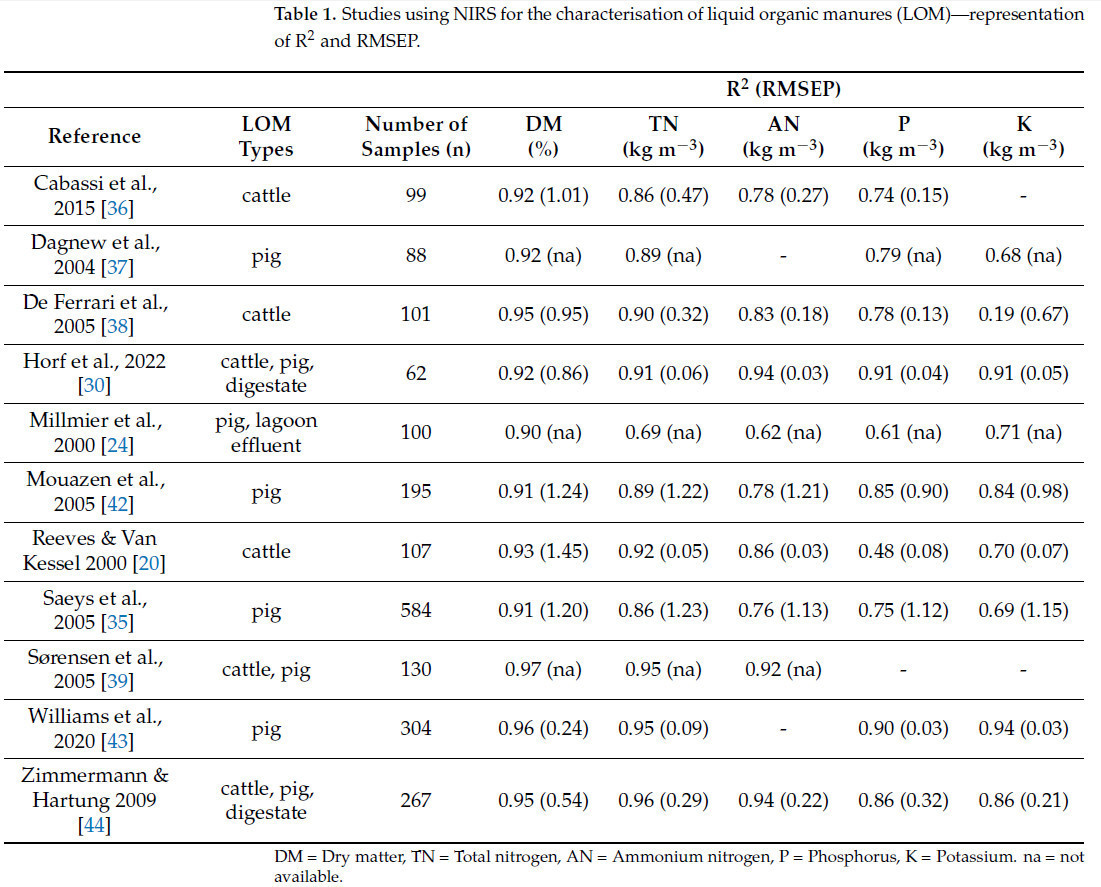 За последние два с половиной десятилетия было проведено несколько исследований, посвященных производительности NIRS для измерения характеристик ЖОУ, имеющих значение для принятия фермерами решений о нормах внесения. Большинство исследований посвящены анализу ЖОУ КРС или свиней. В дополнение, в таблице перечислены два исследования с биогазовыми остатками. Количество образцов колеблется от 62 до 584 образцов (Таблица 1).