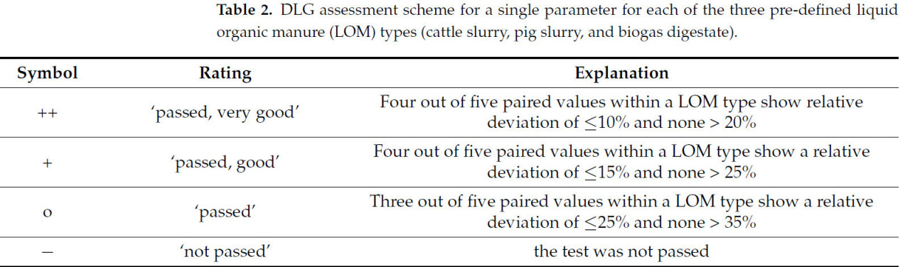 Немецкое сельскохозяйственное общество (DLG) проводит испытания в условиях, близких к фермерским. Они тестируют мобильные датчики NIRS для определения компонентов в ЖОУ (т.е., жидкого навоза животноводческих ферм (жидкий навоз КРС, свиная жижа и смешанный навоз из жидкого навоза КРС и свиной жижи) и биогазовых остатков от сбраживания жидкого навоза КРС и свиней с добавлением возобновляемого сырья) для определения эквивалентности с лабораторным анализом с использованием официально признанных методов [49]. Этот тест DLG охватывает параметры: СВ, TN, AN, P и K, и для этих испытаний выбираются пять типичных ЖОУ с разных ферм на основе содержания сухого вещества (жидкий навоз КРС с 4–9% СВ, свиная жижа с 2–7% СВ и дигестат с 5–8% СВ). Для каждого испытания количество от 3 до 5 м³ ЖОУ перекачивается в контейнер, оборудованный насосом и стандартной трубной системой. Затем к трубной системе подключаются датчики, подлежащие испытанию, и байпас для отбора лабораторного образца сравнения. На первом этапе ЖОУ тщательно гомогенизируется путем непрерывной перекачки. Затем датчики NIRS включаются. Как только отображаемые измеренные значения стабилизируются, данные NIRS документируются, и образцы отбираются через байпас для референсного анализа в лаборатории. Образцы ЖОУ сразу после сбора глубоко замораживаются при -18 °C и отправляются в пять различных аккредитованных лабораторий для анализа. Затем относительное отклонение значения датчика для каждого параметра по сравнению с референсным значением (рассчитанное как среднее арифметическое пяти лабораторных результатов) используется для проверки точности измерения датчиков NIRS. Отдельные параметры типа ЖОУ сертифицируются в соответствии с каталогом критериев, разработанным испытательным центром DLG (Таблица 2). В качестве минимального требования DLG установила, что содержание TN должно надежно определяться с помощью датчика NIRS, т.е., испытание для этого компонента должно быть пройдено.