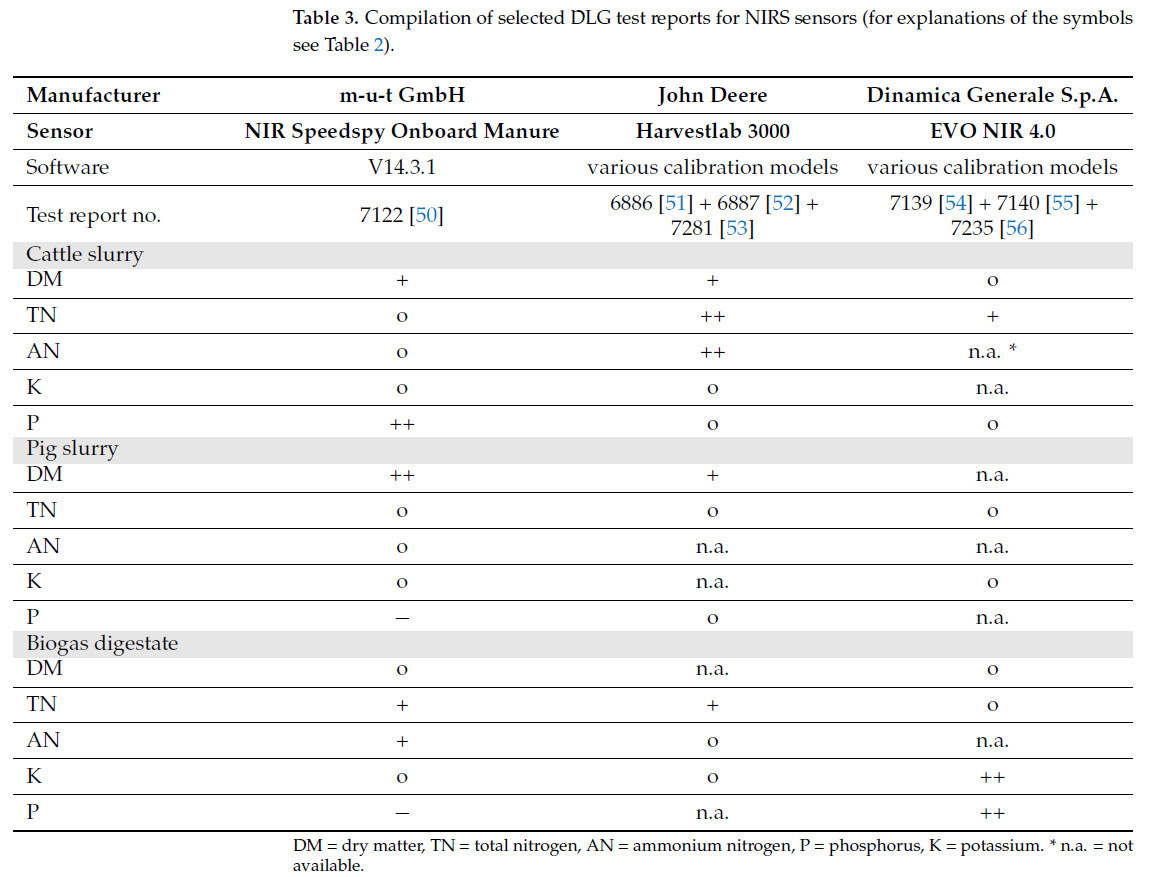 Таблица 3 обобщает отчеты об испытаниях DLG для датчиков NIRS от трех производителей, которые предлагают соответствующие устройства для использования на ферме в Германии, классифицированные по соответствующим компонентам для типов ЖОУ: жидкий навоз КРС, свиная жижа и биогазовый дигестат.