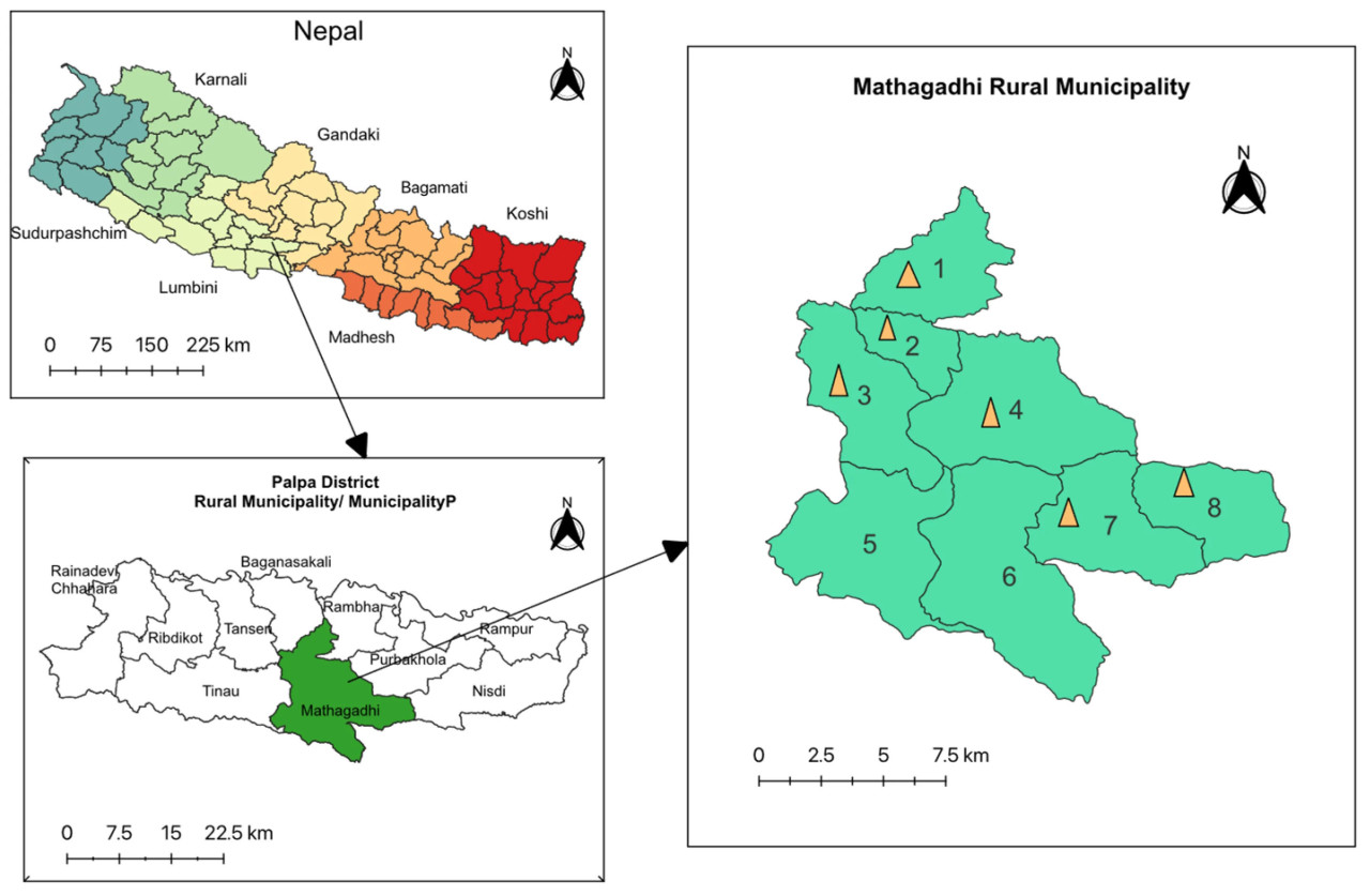 Мы провели это исследование в сельском муниципалитете Матхагадхи, который расположен в 25 км от административного центра района Палпа, провинция Лумбини, Непал. Эта территория находится в средних холмах средне-западной части Непала (см. Рисунок 1: Карта места исследования). Сельский муниципалитет Матхагадхи является местным органом власти и имеет 8 вард. Варды — самый мелкий административный уровень в Непале. Географически это крупнейший по площади местный орган власти в районе Палпа из 10, площадью 215,49 кв. км. Поселения в вардах разбросаны на склонах складок холмов, как правило, на высоте 1500 м над уровнем моря, где основным способом передвижения является пеший ход. Для многих поездка в муниципальный офис для получения государственных услуг, включая сельскохозяйственные услуги и рынок в окрестностях, может быть дневной работой. Среднегодовая температура Матхагадхи составляет приблизительно 23 °C. Летом температура может подниматься до 33 °C, а зимой опускаться до 3 °C. Основными производимыми зерновыми культурами являются рис, кукуруза, пшеница и просо.
