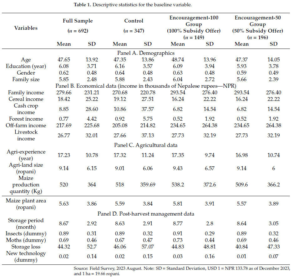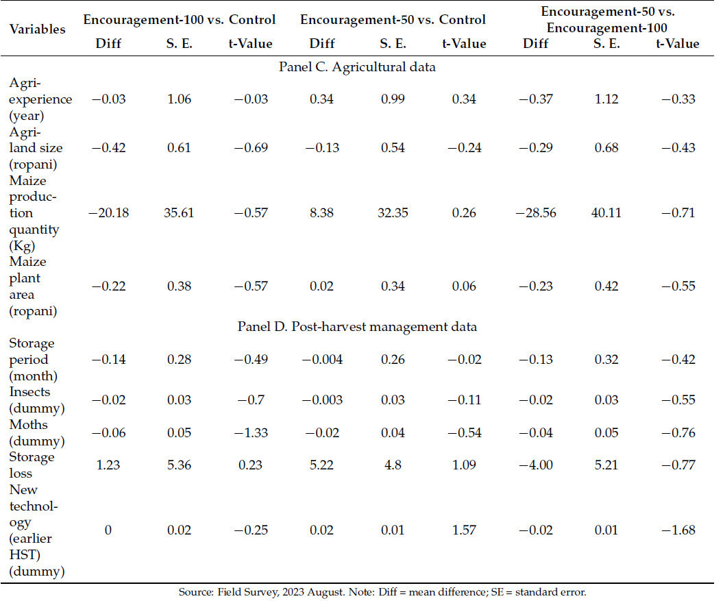 Панель C показывает, что средний сельскохозяйственный опыт глав домохозяйств составляет 17,23 года. Их средний размер сельскохозяйственных земель составляет 9,14 ropani (1 га = 19,66 ropani). Средняя площадь посадки кукурузы составляет 5,63 ropani, а среднее производство кукурузы — 520 кг. Также среднее производство кукурузы домохозяйств в контрольной группе, группе поощрения-100 и группе поощрения-50 составляет 518 кг, 538,2 кг и 509,6 кг соответственно. В среднем 133 кг кукурузы используется для потребления в пищу, 389 кг для кормления животных и 27 кг для других целей (пивоварение и приготовление сухой пищи в зимний сезон). Следовательно, срок хранения зависит от произведенного количества, варьируясь от 2 месяцев до 17 месяцев. Кроме того, только 3,8% респондентов продавали зерно кукурузы.