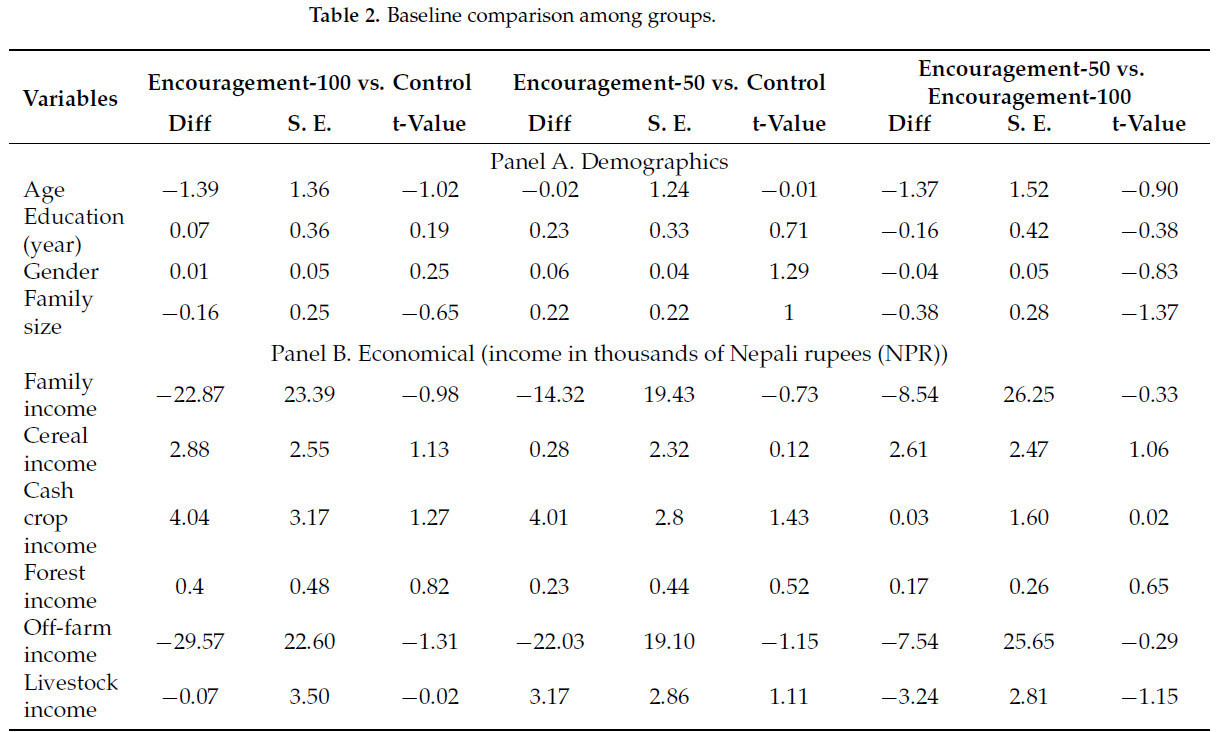 Мы провели тест баланса с использованием парного t-теста, чтобы проверить сходство между группами по базовым характеристикам. Таблица 2 показывает результаты проверки баланса. Мы обнаружили, что предварительные различия между контрольной группой и группой поощрения-100, а также контрольной группой и группой поощрения-50 были в среднем сбалансированы. Также переменные были сбалансированы между группой поощрения-50 и группой поощрения-100.