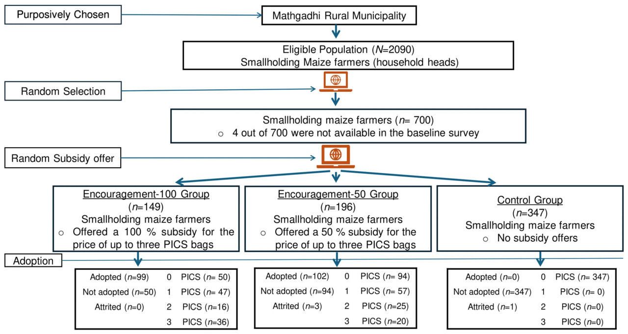 Хотя мешки PICS были представлены в исследуемом районе, фермеры не были с ними знакомы, что могло привести к высоким уровням несоблюдения при внедрении мешков PICS во время эксперимента. Таким образом, мы решили увеличить размер выборки до большего, чем требуемый минимум, чтобы увеличить выборку в каждой группе вмешательства, также учитывая другие ограничения по бюджету, времени и наличию помощников исследователей. Учитывая все эти факторы, 700 из 2090 мелких фермеров в списке были выбраны случайным образом, и 50% были распределены в контрольную группу, 30% в группу поощрения-50 и 20% в группу поощрения-100. Случайный отбор проводился с помощью программного обеспечения STATA-17 (STATACorp LLC, TX, US). Четыре фермера не были найдены во время базового обследования; следовательно, они были исключены, и 696 образцов оставались действительными в базовом обследовании.