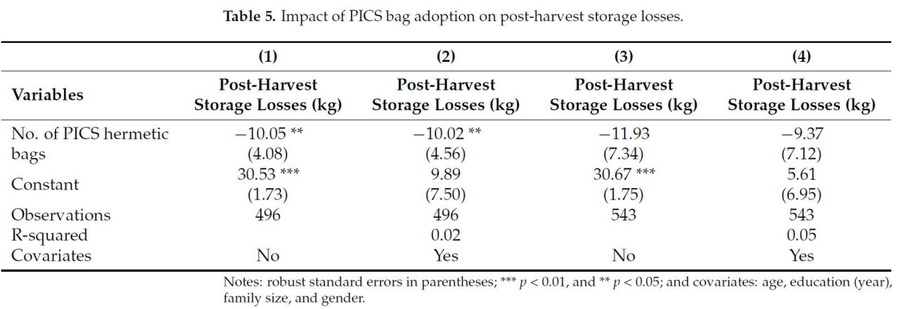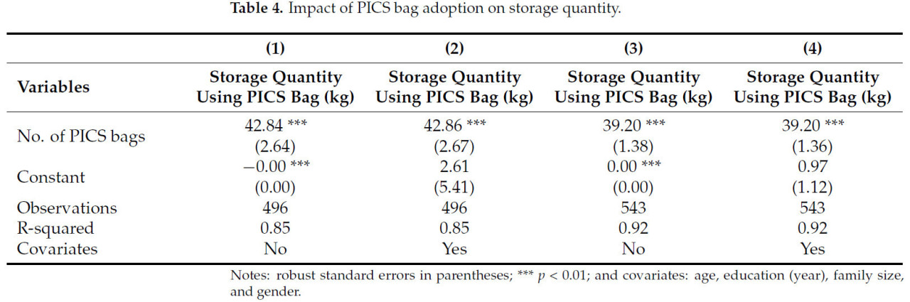 Коэффициенты предполагают, что одна дополнительная единица внедренного герметичного мешка PICS приводит к хранению кукурузы в 47,15 и 47,68 кг без ковариат и с ковариатами соответственно, что статистически значимо на уровне 1% (p-значение < 0,01) и согласовано независимо от ковариат.