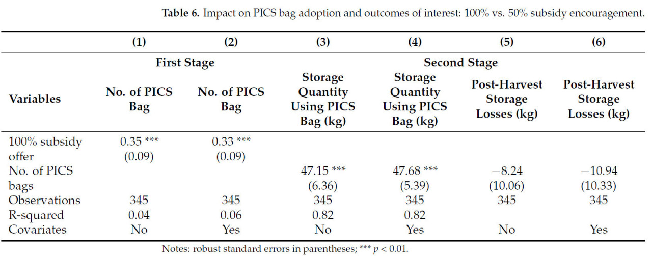 Таблица 6 иллюстрирует первую стадию и оценки IV для фермеров, поощренных 100% субсидией, относительно тех, кто поощрен 50% субсидией. Колонки (1) и (2) таблицы показывают влияние 100% субсидии на количество внедренных мешков PICS без ковариат и с ковариатами соответственно, со значениями коэффициентов 0,35 и 0,33, которые значимы на уровне 1% (p-значение < 0,01), указывая, что предложение 100% субсидии является подходящим IV для оценки влияния количества внедренных мешков PICS на интересующие результаты. Аналогично, колонки (3) и (4) таблицы представляют коэффициент влияния внедрения мешков PICS на количество хранимой кукурузы для фермеров, поощренных 100% субсидией, относительно тех, кто поощрен 50% субсидией, без ковариат и с ковариатами соответственно.