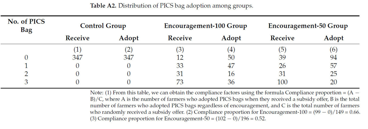 В нашем поощрительном дизайне уровень соблюдения для внедрения мешков PICS фермерами в группе поощрения-100 составляет 0,66, в то время как уровень соблюдения фермеров в группе поощрения-50 составляет 0,52 (Приложение A, Таблица A2). Та же таблица показывает, что 92% мелких фермеров используют мешки, когда получают их бесплатно, и 80% покупают хотя бы один мешок PICS с 50% субсидией. Несмотря на то, что им была предоставлена краткая информация о герметичных мешках для хранения семян и зерна, о том, как они работают, и шаги по их правильному использованию во время базового обследования, уровень соблюдения был ниже ожидаемого.